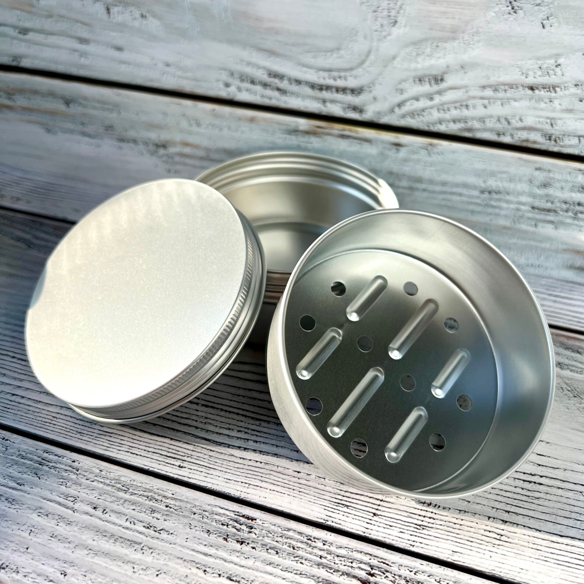 Praktisches Reiseset bestehend aus einer Aluminium Seifendose mit herausnehmbarem Abtropfsieb.